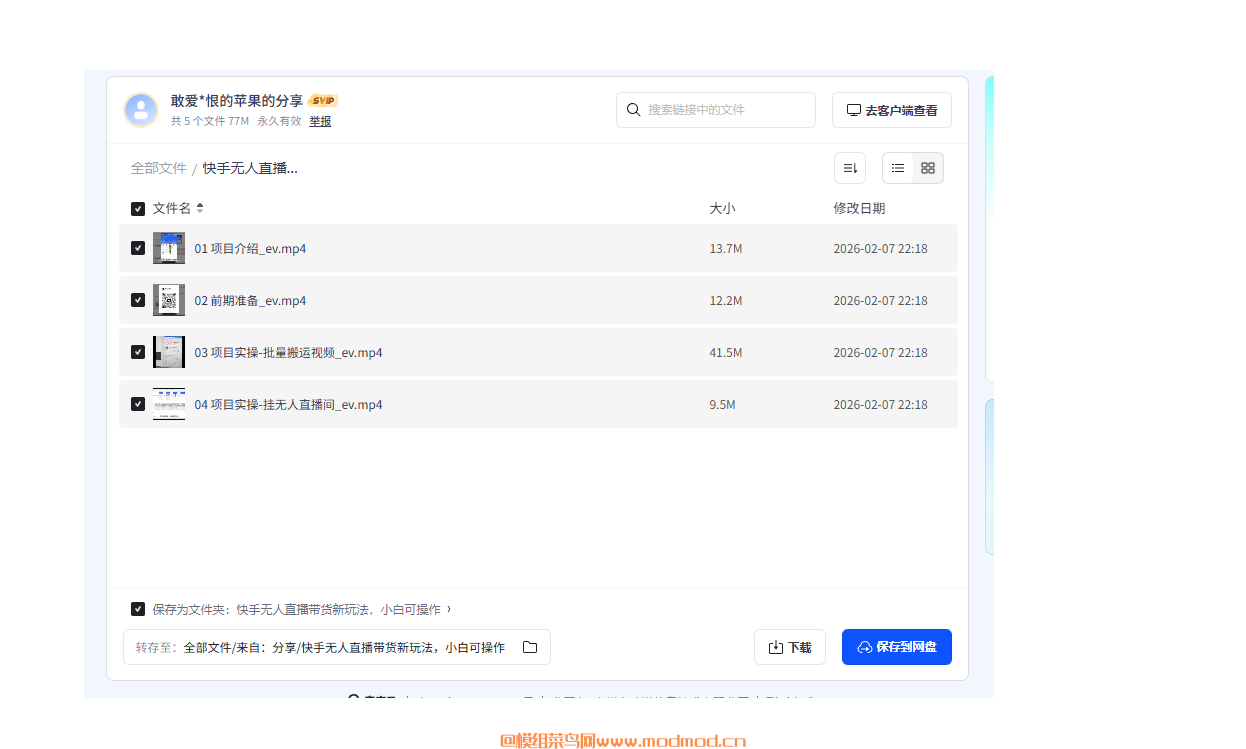 快手无人直播带货新玩法,小白可操作 ┝━01 项目介绍_ev.mp4 ┝━02 前期准备_ev.mp4 ┝━03 项目实操-批量搬运视频_ev.mp4 ┝━04 项目实操-挂无人直播间_ev.mp4
